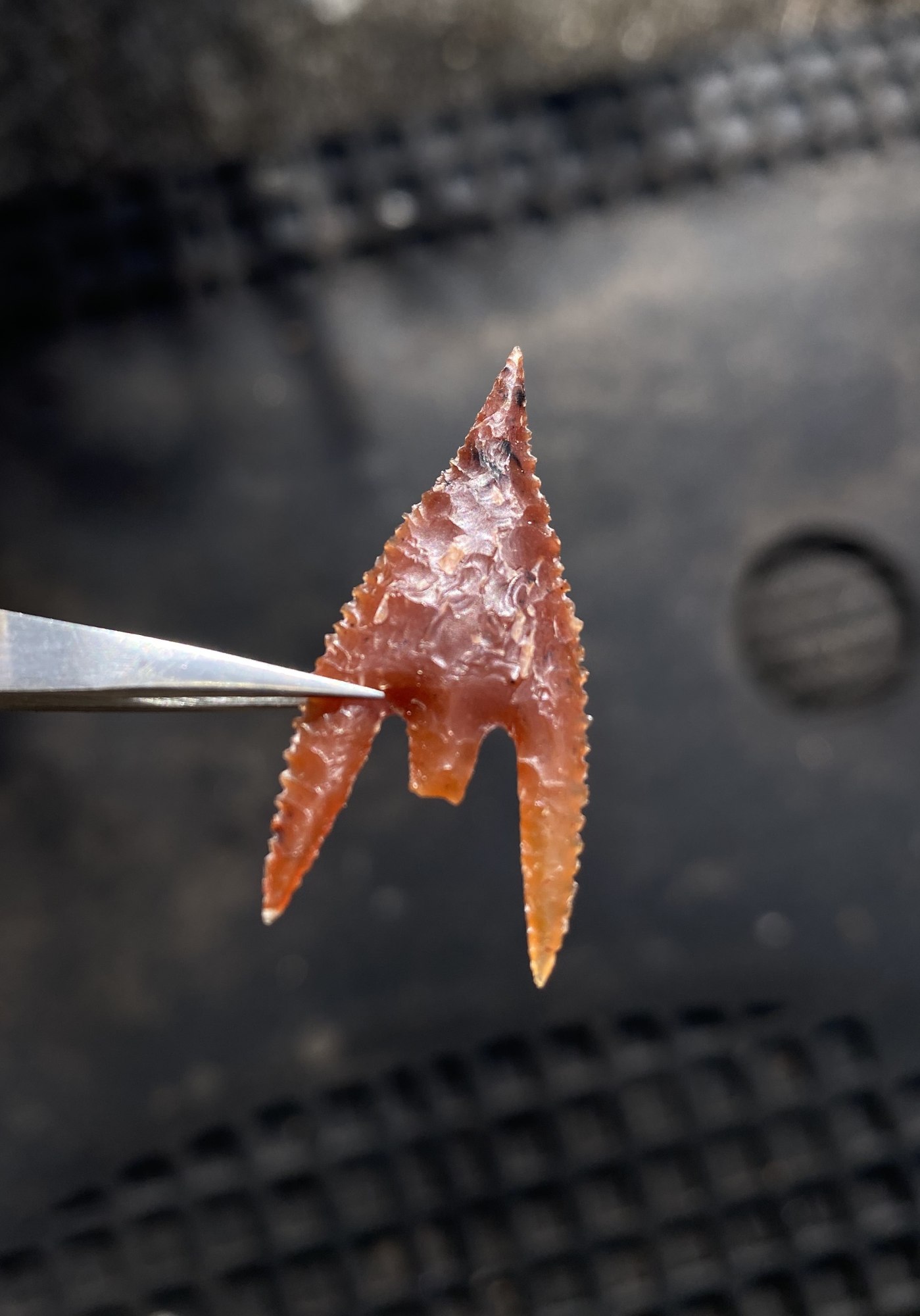This cool looking Gunther point has a narrow, Eiffel Tower shaped tip, fine serrations and long, fragile barbs. It’s made of heat treated coastal plains flint and has wickedly sharp edges.
