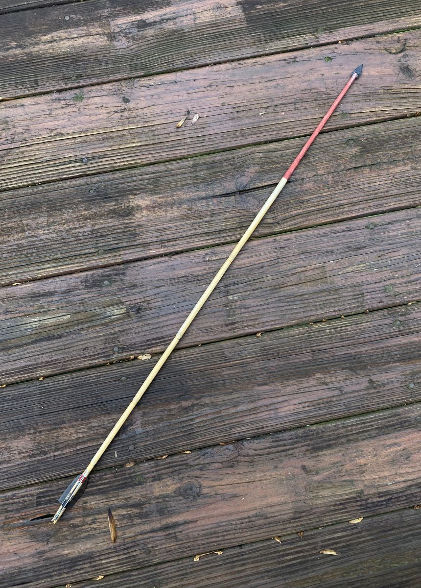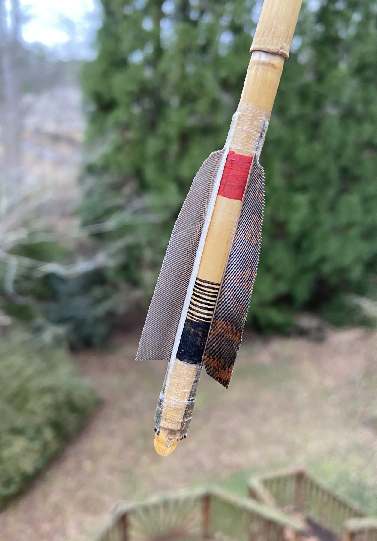This arrow has a main shaft of reed and a foreshaft made from a hardwood shoot. It’s fletched with turkey tail feathers and the feathers are quite short and small, just like they were on the original artifact. The paint design under the feathers copies the original artifact, but the paint design at the front of the arrow is unknown since the arrow was broken and the front was missing. Other distal arrow fragments from that pueblo had hardwood foreshafts that were painted red, so I copied them in this replica. To retain this replica’s archaeological accuracy, I made the stone point from a fine-grained basalt that came from Northern Arizona. The point is held in place with pine sap glue and also a wrapping of deer sinew. All the other wrappings on this arrow are deer sinew as well.
