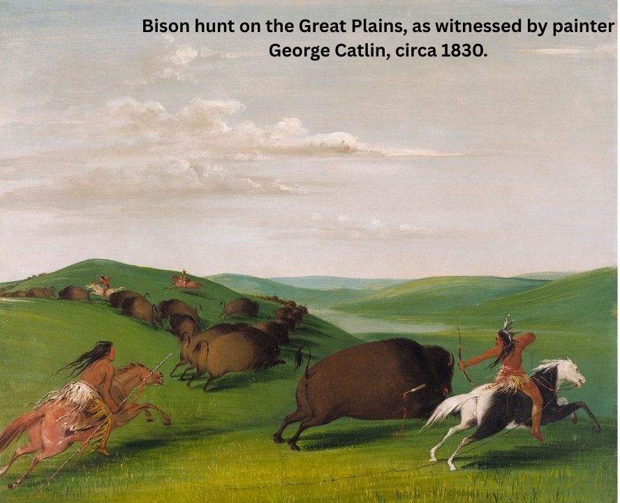 This colorful Sioux arrow replica is a copy of an authentic Sioux arrow in a museum in Wisconsin. The shaft is made of a hardwood shoot. It’s fletched with turkey wing and tail feathers, one of which is dyed red. The metal point is made from an old barrel hoop and sinew wraps hold everything together. Identical arrows made by Sioux warriors were used for hunting and warfare. As you scroll through the photos, check out the painting by George Catlin, showing a buffalo hunt he witnessed in the early 1800’s. The Plains warriors used arrows identical to this one to bring down 2,000 lb bison with one shot. How’s that for owning a piece of history?